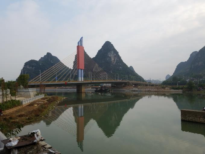 賀州市靈峰大橋工程位于八步區(qū)賀江一橋下游0.9公里處,北岸接靈峰北路,是連接賀江兩岸、緩解城市交通壓力、方便居民的重要通道之一。靈峰大橋設(shè)計(jì)全長為465.018米,其中南引道長50.448米,北引道長80.570米,引道全長131.018米,橋梁長度為334米,橋面寬度27米,按雙向四車道設(shè)計(jì)。主橋采用獨(dú)塔單索面預(yù)應(yīng)力混凝土展翅箱梁斜拉橋,邊跨跨徑68米,主跨跨徑86米,全長154米。橋面以上塔高51米,全橋設(shè)計(jì)共有77根樁基、9個(gè)承臺(tái)、7個(gè)墩身、2個(gè)橋臺(tái)。