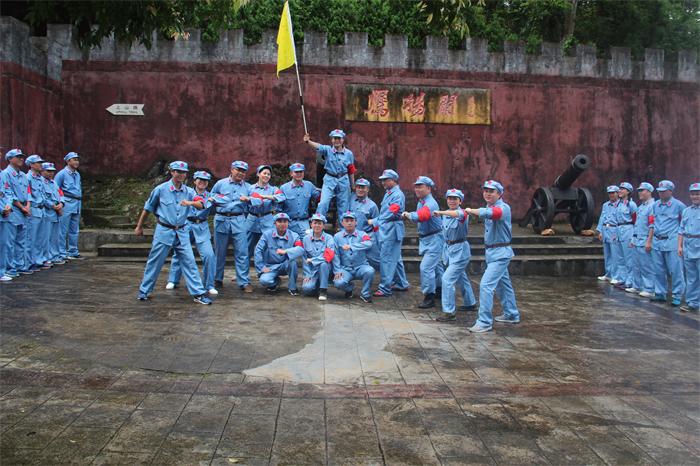 經(jīng)過一路爬涉,我們終于到達了紅七軍廣場。廣場足有兩個球場寬大,廣場的背景是一幅紅七軍的巨型浮雕,“鷹揚關(guān)”三個大字蒼勁有力赫然其中,兩門古炮架設(shè)兩旁蔚為壯觀。據(jù)教官介紹,這里就是湘、桂、粵三省交界處,號稱“一腳踏三省”的地方。遙想當(dāng)年,紅七軍就是在這里集結(jié)從廣西進入廣東連山。
