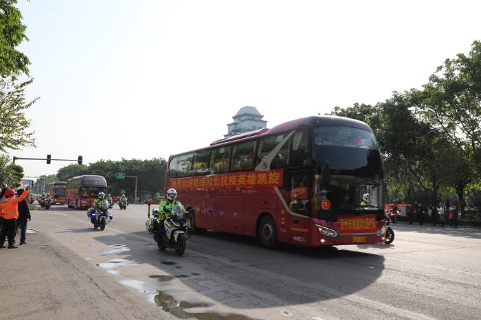 下午16點整,載著賀州支援湖北醫(yī)療隊的大巴車在33輛摩托車鐵騎、兩輛警車的引導(dǎo)護航下駛?cè)胭R州大道,警燈閃爍、警笛嘹亮,沿途市民揮舞國旗,夾道歡迎,高聲歡呼,壽城人民用最高禮遇,最深敬意,迎接英雄凱旋,表達對英雄的敬意。