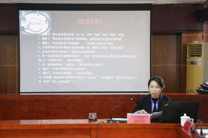 湯彩燕圍繞黨的二十大報(bào)告關(guān)于國(guó)企改革的重要論述和部署進(jìn)行系統(tǒng)宣講,深入解讀了黨的二十大報(bào)告對(duì)國(guó)企改革提法上的變化以及二十大報(bào)告標(biāo)志了國(guó)企改革的八大趨勢(shì)等內(nèi)容。她表示,習(xí)近平總書記在黨的二十大報(bào)告中,對(duì)深化國(guó)資國(guó)企改革作出了新的重大部署,對(duì)于國(guó)資國(guó)企改革的時(shí)代背景、方向、使命任務(wù)、目標(biāo)、途徑、要求做出表述,有清晰的時(shí)代感與厚重的實(shí)在感,為全面建設(shè)社會(huì)主義國(guó)家新征程國(guó)有企業(yè)改革指明了方向、提供了根本遵循。